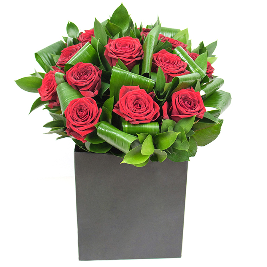 Our red rose bouquet is a beautifully crafted combination of vibrant roses, aspidistra leaves, and ruscus. This distinctive arrangement brings luxury and elegance to any environment.